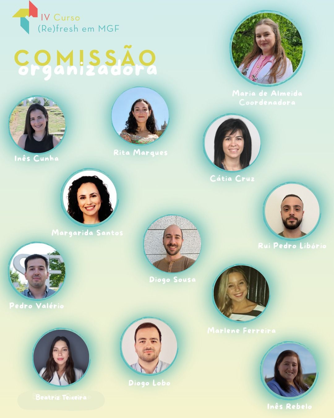 A Comissão Organizadora (CO) da IV Edição do Curso (Re)Fresh em MGF é composta por 12 Médicos Internos de Formação Especializada (IFE) em Medicina Geral e Familiar (MGF), de diferentes Unidades de Saúde Familiar (USF) da Unidade Local de Saúde Viseu Dão-Lafões (ULS VDL).